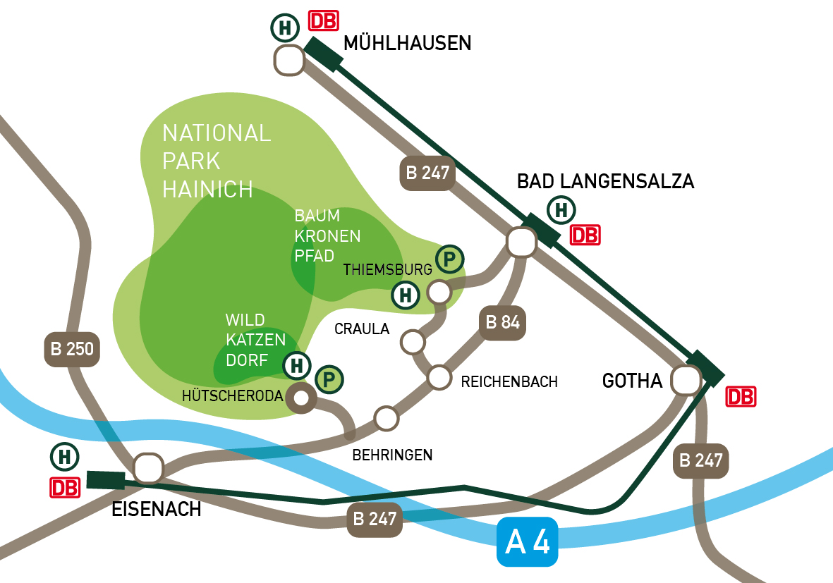 Nutzen Sie den ICE-Halt in Eisenach. Fußläufig erreichen Sie den Busbahnhof, von welchem es für Sie mit dem Hainichbus oder dem Linienbus 150 in 20 Minuten nach Hütscheroda geht. Auch vom Bahnhof in Bad Langensalza können Sie mit dem Hainichbus nach Hütscheroda fahren.