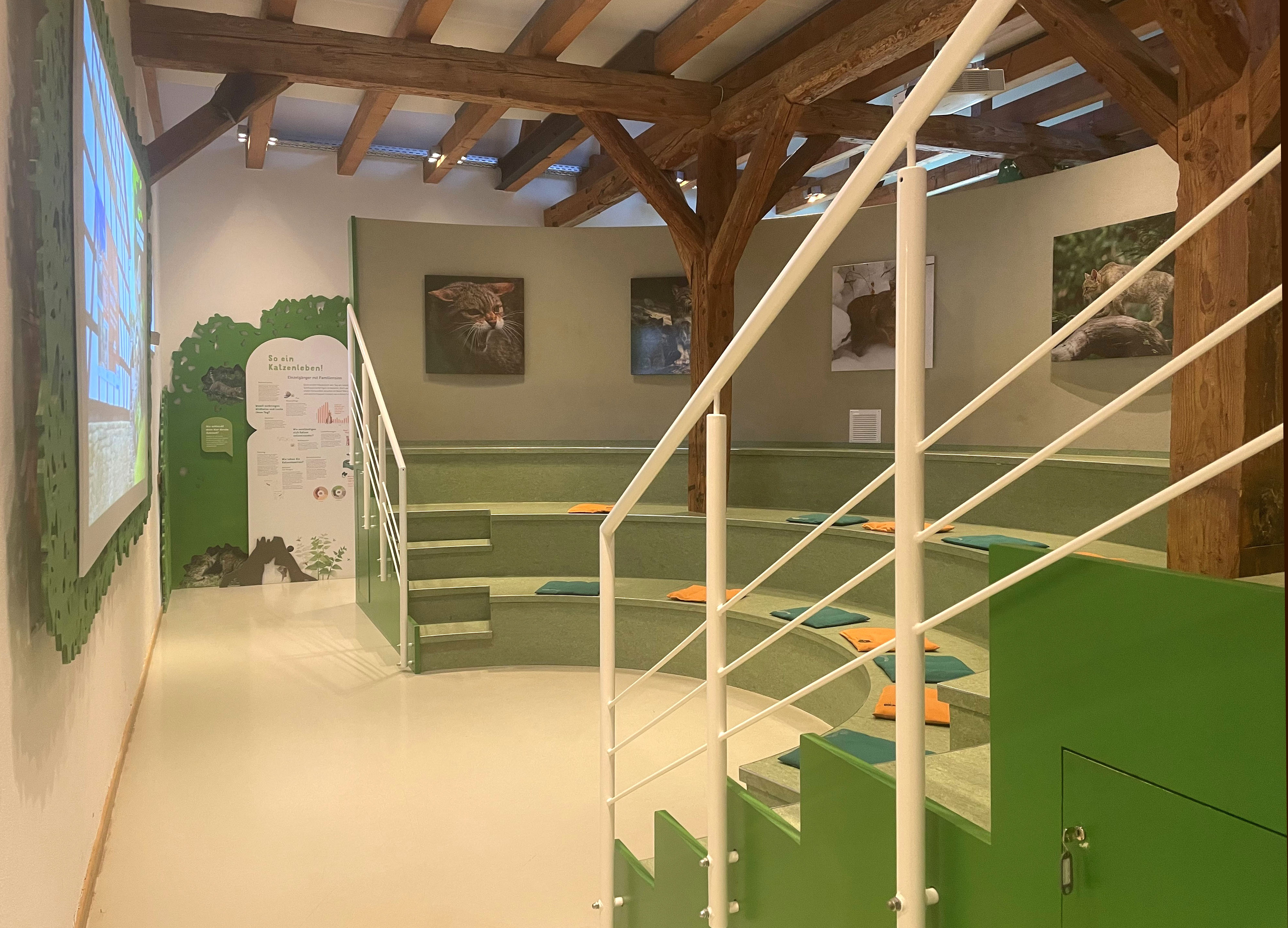 Am Ende der Ausstellungsfläche können Sie im Kino auf einer der drei Ebenen Platz nehmen und sich kurzweilige Filme zu Wildtieren, Wildkatzen und Luchsen anschauen.