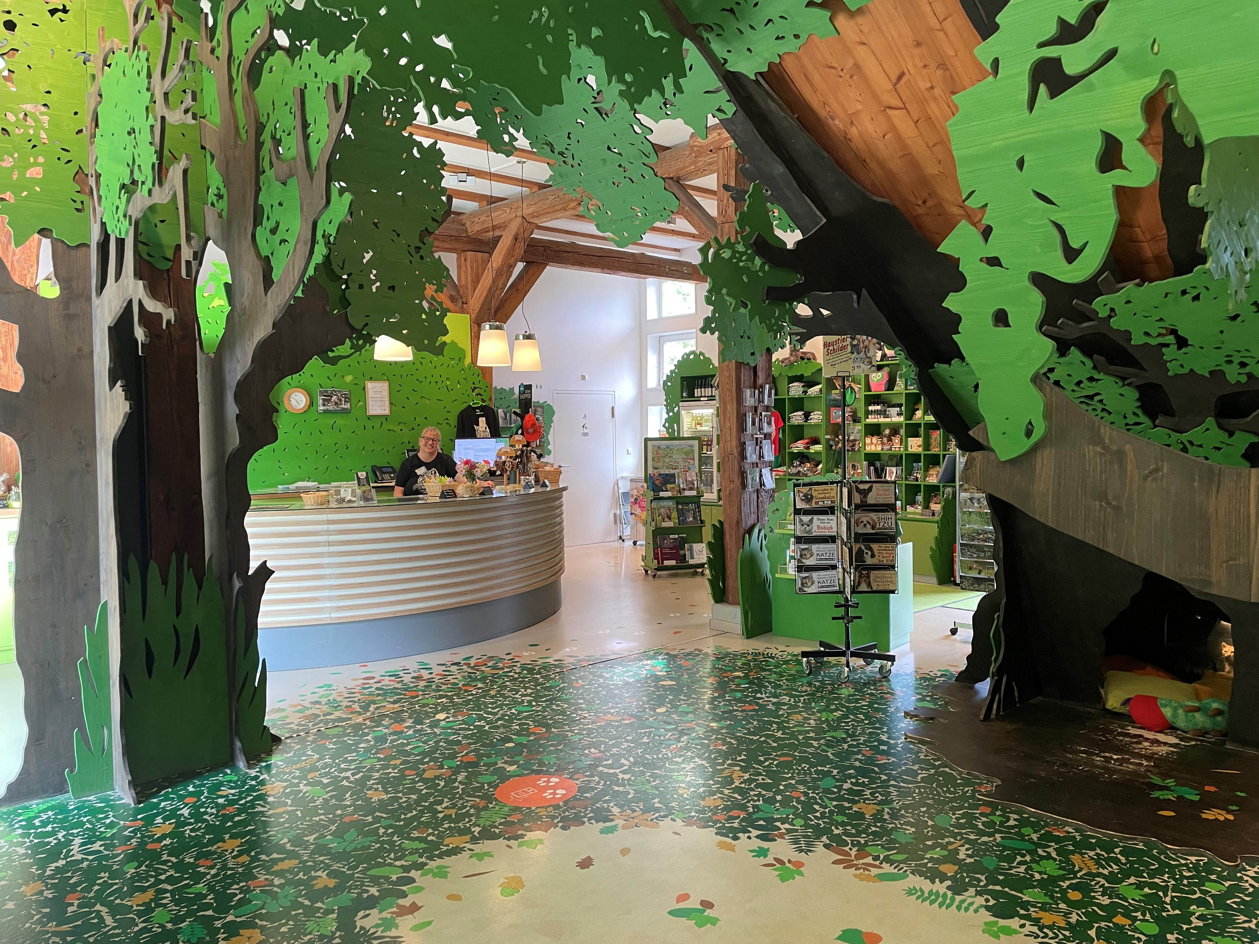 Hinter dem Kassenbereich finden Sie die Nationalparkinformation. Diese ist am Wochenende und an Feiertagen mit einem Ranger des UNESCO-Weltnaturerbe Nationalpark Hainich besetzt. Die Ranger beantworten gern Ihre Fragen.